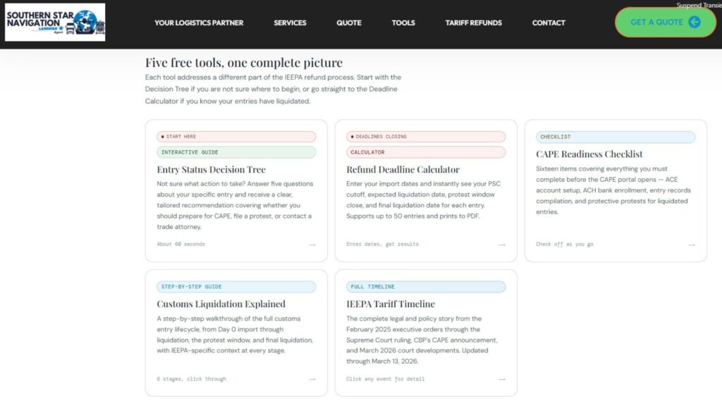 Southern Star Navigation has built a free IEEPA Tariff Refund Resource Center at southernstarnavigation.com with tools to help you check your eligibility, calculate your deadlines, and make sure you are ready before the portal opens. Our resource center includes an Entry Status Decision Tree, a Refund Deadline Calculator, a CAPE Readiness Checklist, a Customs Liquidation Guide, and a full interactive IEEPA Tariff Timeline updated through this week’s latest court order. Visit our IEEPA Refund page for all the details.