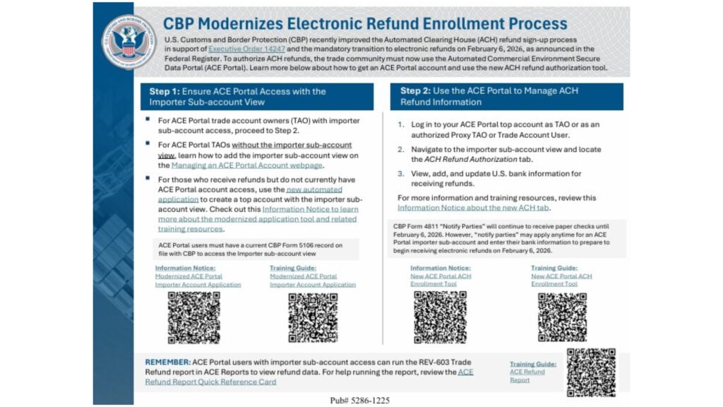 For importers and trade partners, this is an operational change that requires action. To receive refunds without delays, companies must be properly enrolled for ACH refunds through the ACE Portal and make sure their account and banking information is accurate and up to date. CBP has released new FAQs, reference guides, and training resources to help with the transition. This doesn’t change refund eligibility, but it does change how the money is delivered, so confirming your setup now is important to avoid missed or delayed refunds.