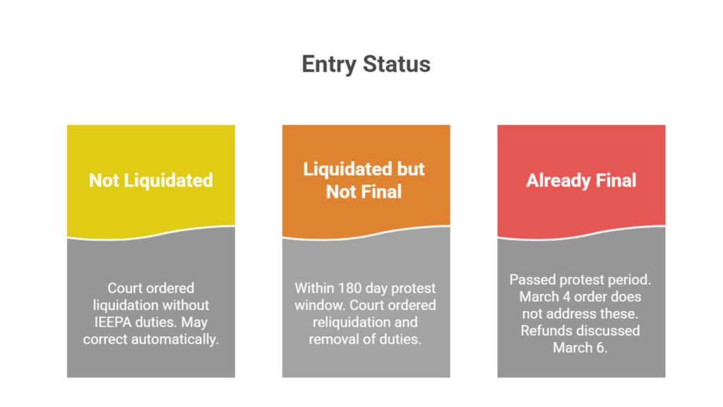 The March 4 order focuses on entries that remain legally open under the customs framework. It does not yet establish a final nationwide refund process or determine how entries that are already final will ultimately be handled.